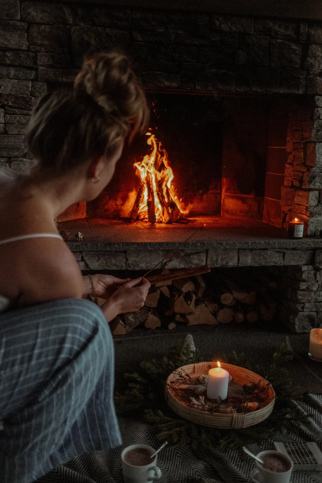“Morgonens första ljus smyger sig in genom fönstren och sveper försiktigt över rummet. Du vaknar till klangskålen, dov musik och frisk fjälluft som susar in genom fönstret. I det stora yogarummet sprakar en öppen eld och med låg och medveten andning börjar du röra kroppen på mattan med mjuka rörelser, precis som om våra kroppar vore en naturlig förlängning av omgivningarna, och vi låter varje andetag leda oss genom stilla flöden. Känslan av jorden under händerna och fötterna ger oss en djup förankring – här, i denna stillhet, är vi helt närvarande.”